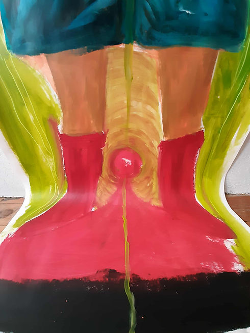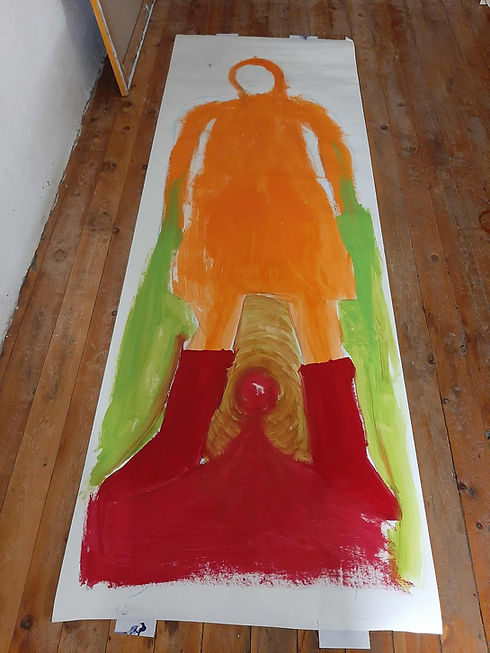 I rolled out a white paper and sat on the floor with a blue crayon. I started drawing myself, it felt clumsy, disproportionate, like it would be wrong. But I did it anyway. I poured in orange and red, those were the colors I needed. Then a hole appeared in between, and I let everything rest. To create before self-censorship. To let the body speak before the brain analyzes.