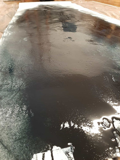 I took the black paint and filled myself with it. I even forgot to take a photo during the process, because it was so incredibly exciting. There was so much water. A lot of water to breathe with and let move into the black. It was almost as if the paint had a life of its own and I just followed along. I let a lot of it flow. I followed my intuition all the way, impulse after impulse. There was something special about standing there and holding up the big sheet. It felt like a little improvisational theater, where I and the painting responded to each other. When I look at it now, I see myself in it. Front, back, how I turn, how I look in different directions. I see the contours of bodies and figures emerging. I can sit for a long time and just be with this painting.