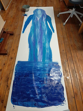 Now I stand here. By the still painting. She lies there… underwater. For the first time I see myself without hair. It’s strange. Naked. Something in me opens up in that image. She looks away. A little twisted. As if she already knows something I don’t yet understand. And slowly… I begin to see my own contours in her. More and more. It’s as if she’s showing me my form before I dare to step into it myself.